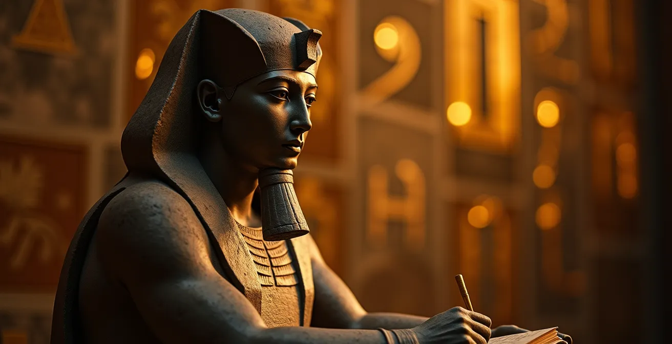 Cet article propose une rupture. Oubliez la course aux chefs-d’œuvre et adoptez la posture de l’égyptologue. Nous allons vous donner les clés de lecture, la « grammaire visuelle » pour décoder ces objets-récits. Nous commencerons par percer le secret de l’alphabet des dieux, les hiéroglyphes, grâce au génie de Champollion. Puis, armés de ce savoir, nous apprendrons à lire le message de pouvoir derrière les statues iconiques, à comprendre ce que les momies nous disent sur la vie quotidienne et enfin, à décrypter la scène la plus cruciale de leur existence : le jugement de l’âme. Transformez votre visite en une conversation de 3000 ans avec les pharaons.